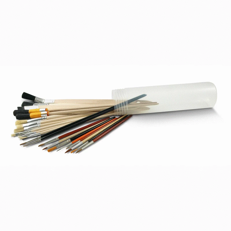 Aquarellpinsel, Synthetikhaar, weiß lackierter Stiel, Gr. 2; Rotmarder, Gr. 1; Ölmalpinsel, flach, helles Rindshaar, Gr. 4 und 8; Ausbesserungspinsel, Feinhaarmischung, Gr. 8; Plakatschreiber, flach, Synthetikhaar, Gr. 10; Borstgussowpinsel, Gr. 6; Strichzieher, flach, M5 hell, Gr. 16; Strichzieher, rund, M5 hell, Gr. 12; Schrägstrichzieher, M6 schwarz, Gr. 20; Plattpinsel, gebogen, M6 schwarz, Gr. 20; Plattpinsel, gerade, M6 schwarz, Gr. 20; Ölmalpinsel, flach, Synthetikhaar, Gr. 6; Borstgussowpinsel, Gr. 12; Ringstrichzieher, M6 schwarz, Gr. 000