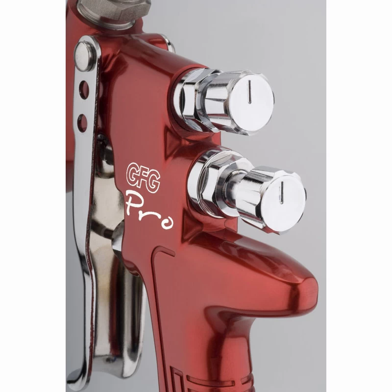 Diese GFG PRo Spritzpistole ist eine Profi-Spritzpistole, deren Design konventionelle Hochdrucktechnologie umfasst. Die HVLP-Technology reduziert „Overspray“ und begrenzt den Luftkappendruck auf 0,7 bar (10 psi). Trans-Tech® ist EPA-konform, da eine Übertragungsleistung über 65 % erzielt wird.