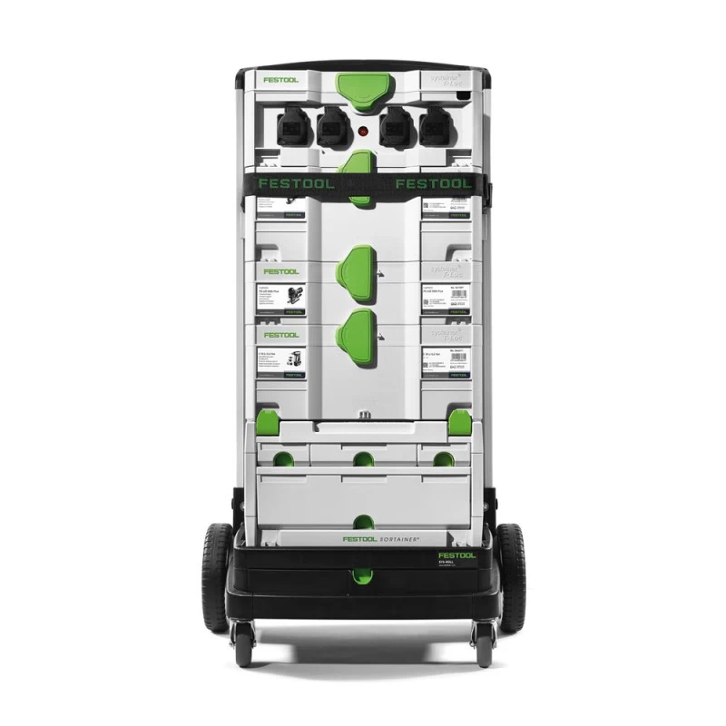 Bei Bedarf kann innen zusätzlich ein Mobiltelefon oder Tablet geschützt geladen werden (1x230v Steckdose im Systainer).